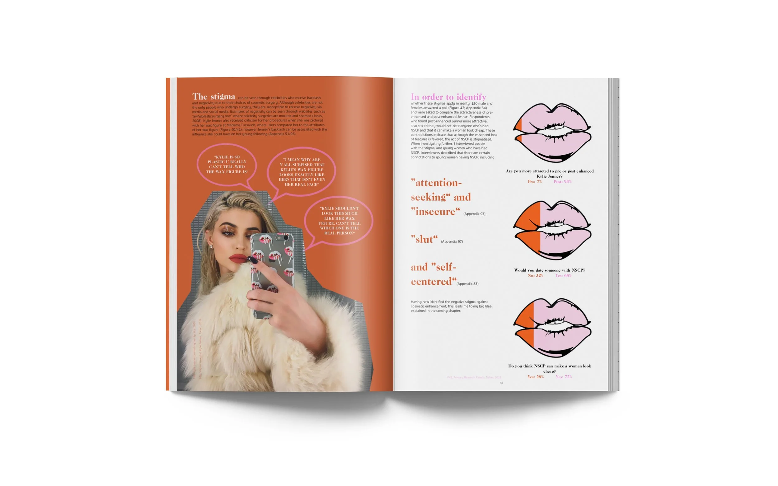 As part of an independent project, I created a series called “The Fake Girl’ Bible”, a project based around body image throughout the 20th century. Themes in this project included body image, male gaze, mental health, cosmetics and medical surgery.